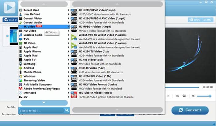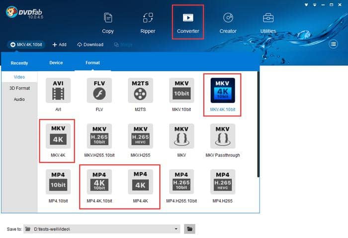 Il est souvent recommandé de ne pas convertir les vidéos SD ou HD ni les vidéos de résolution 640x480 en 4K, car il réduirait considérablement la qualité après la conversion. Il aura évidemment 4000k pixels, mais il n'y aura pas assez de détails car ce n'était pas là dans la vidéo originale elle-même. DVDFab Video Converter est un autre excellent logiciel qui non seulement autorise des fonctionnalités similaires à celles mentionnées dessus, mais aussi dispose beaucoup d'autres puissances. Premièrement, il permet une compatibilité totale avec les processeurs Intel pour tirer parti de l’alimentation multi-cœur et du multithreading pour le traitement en parallèle. Cela permet non seulement une lecture fluide et sans décalage pendant la lecture 4K, mais également une conversion plus rapide de la vidéo au format UHD 4K par rapport aux autres lecteurs. L'autre amélioration des performances consiste à l'utilisation de l'accélération matérielle du GPU, qui permet au programme de traiter la vidéo sur le GPU de l'ordinateur portable ou de l'ordinateur pour améliorer la vitesse de conversion et de lecture. DVDFab Video Converter fournit également un essai gratuit du logiciel. Vous pouvez choisir entre MKV.4K et MP4.4K comme sortie pour la conversion.