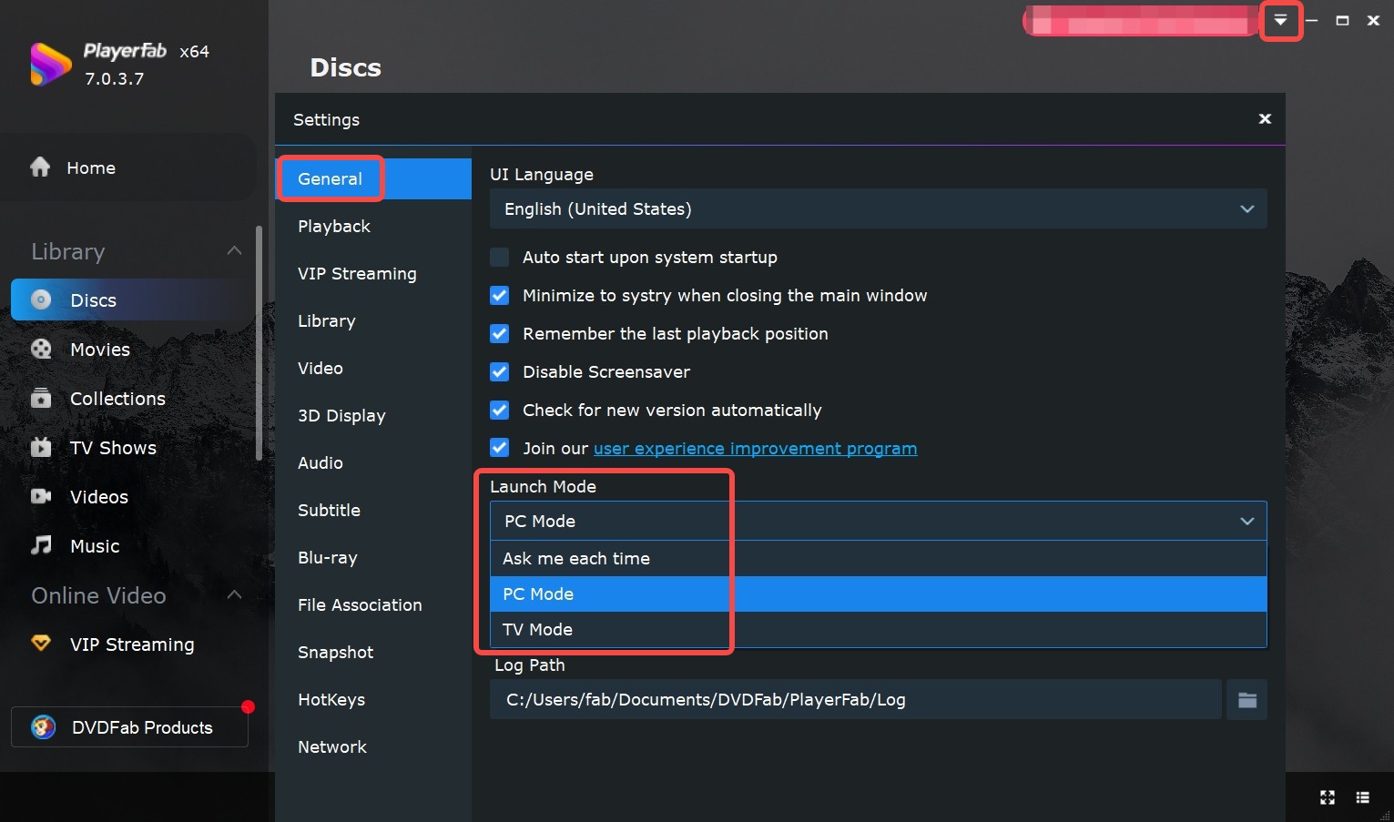 Étape 1 : Lancez PlayerFab sur votre PC. Cliquez sur le bouton « Paramètres » dans le coin supérieur droit et deux options vous seront proposées, parmi lesquelles les modes PC et TV. Sélectionnez le mode PC pour profiter d'une expérience de visionnage de film immersive ultime. Vous pouvez également choisir le mode TV qui vous permettra de lire la vidéo sur un grand écran. Dans ce cas, la télécommande de Windows Media Center vous sera utile.