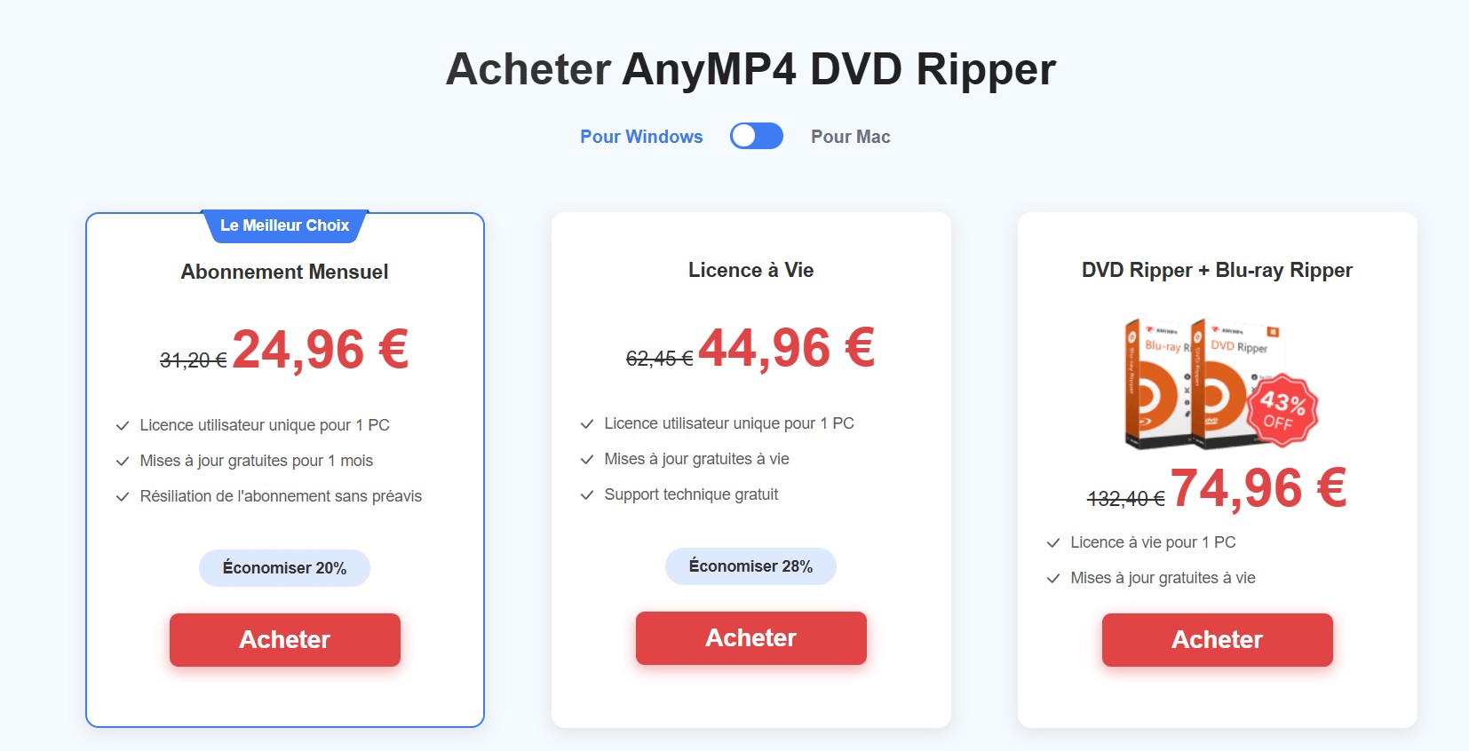 AnyMP4 DVD Ripper propose désormais trois formules d'abonnement : un abonnement mensuel, un abonnement à vie et un abonnement professionnel. Actuellement, vous bénéficiez de 20% de réduction sur la licence à vie et de 58% sur l'abonnement mensuel. 43% de réduction est disponible pour l'ensemble DVD Ripper + Blu-ray Ripper.
