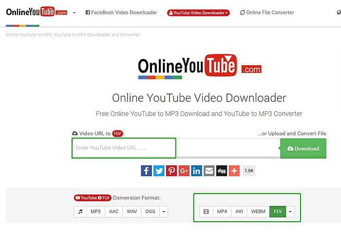 OnlineYouTube.com est également un convertisseur audiovisuel gratuit permettant de convertir YouTube en FLV. Ouvrez ce site Web et mettez le lien YouTube dans la zone de texte, choisissez le format FLV après avoir cliqué sur la flèche vers le bas dans la partie vidéo. Cliquez sur le bouton «Télécharger» pour sortir des vidéos FLV YouTube. Enregistrez la vidéo FLV YouTube dans votre propre dossier ou appareil.