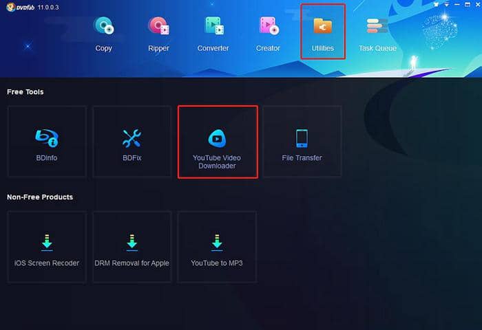 Étape 1: Téléchargez, installez et ouvrez DVDFab 11 pour obtenir un essai gratuit de 30 jours. Cliquez sur le module "Utilitaires" en haut de l'interface d'exploitation principale, puis sur YouTube Video Downloader (veuillez noter que ce module est uniquement disponible sur la version 32 bits de DVDFab). Quelques secondes plus tard, vous verrez un écran contextuel dans lequel vous pourrez rechercher toutes les vidéos YouTube que vous voulez télécharger dans la vidéo en ligne comme sur le site Web YouTube.