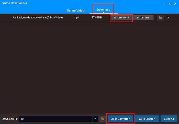 Étape 3: Cliquez sur l’onglet «Télécharger» à côté de vidéo en ligne pour vérifier le processus de téléchargement. Une fois le téléchargement terminé, cliquez sur le bouton «ay convertisseur» pour ajouter automatiquement vos vidéos YouTube préférées au convertisseur YouTube FLV (DVDFab Video Converter) pour un traitement ultérieur. Par ailleurs, le bouton "Tout au convertisseur" est conçu pour ajouter automatiquement plus d'une vidéo YouTube téléchargée au convertisseur FLV YouTube.