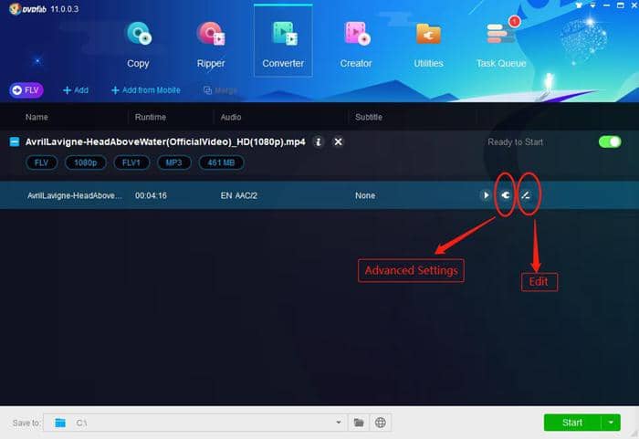 Étape 5: Vous pouvez cliquer sur «Paramètres avancés» et personnaliser votre vidéo FLV YouTube par le bouton «Éditer». Sélectionnez le répertoire de sortie en bas pour enregistrer. Et puis cliquez sur Démarrer pour convertir YouTube en FLV.