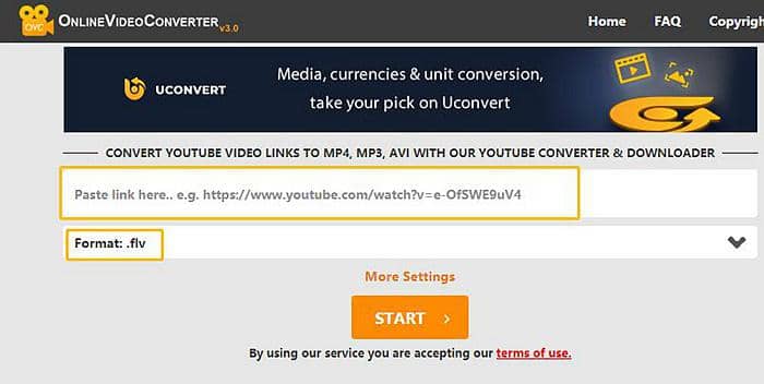 OnlineVideoConverter.com est un convertisseur FLV YouTube en ligne gratuit. Après avoir ouvert le site Web, collez le lien YouTube dans la zone de texte, choisissez FLV dans la liste déroulante, puis cliquez sur DÉMARRER pour convertir YouTube en FLV.