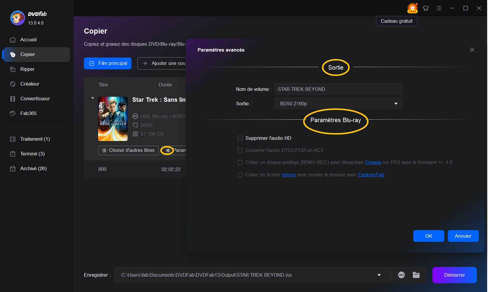 J’ouvre DVDFab → onglet Copie, puis je choisis le mode (Disque complet, Film principal, Cloner 1:1, Personnaliser ou Fusionner). J’insère le Blu-ray ou j’ajoute une image ISO / un dossier BDMV ; l’analyse repère automatiquement playlists et chapitres.